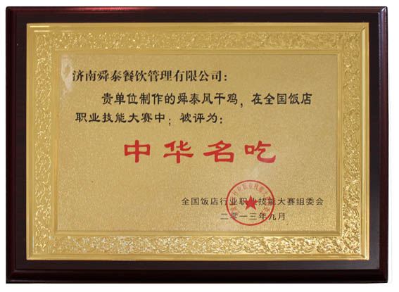我公司的舜泰風(fēng)干雞被評為“中華名吃”